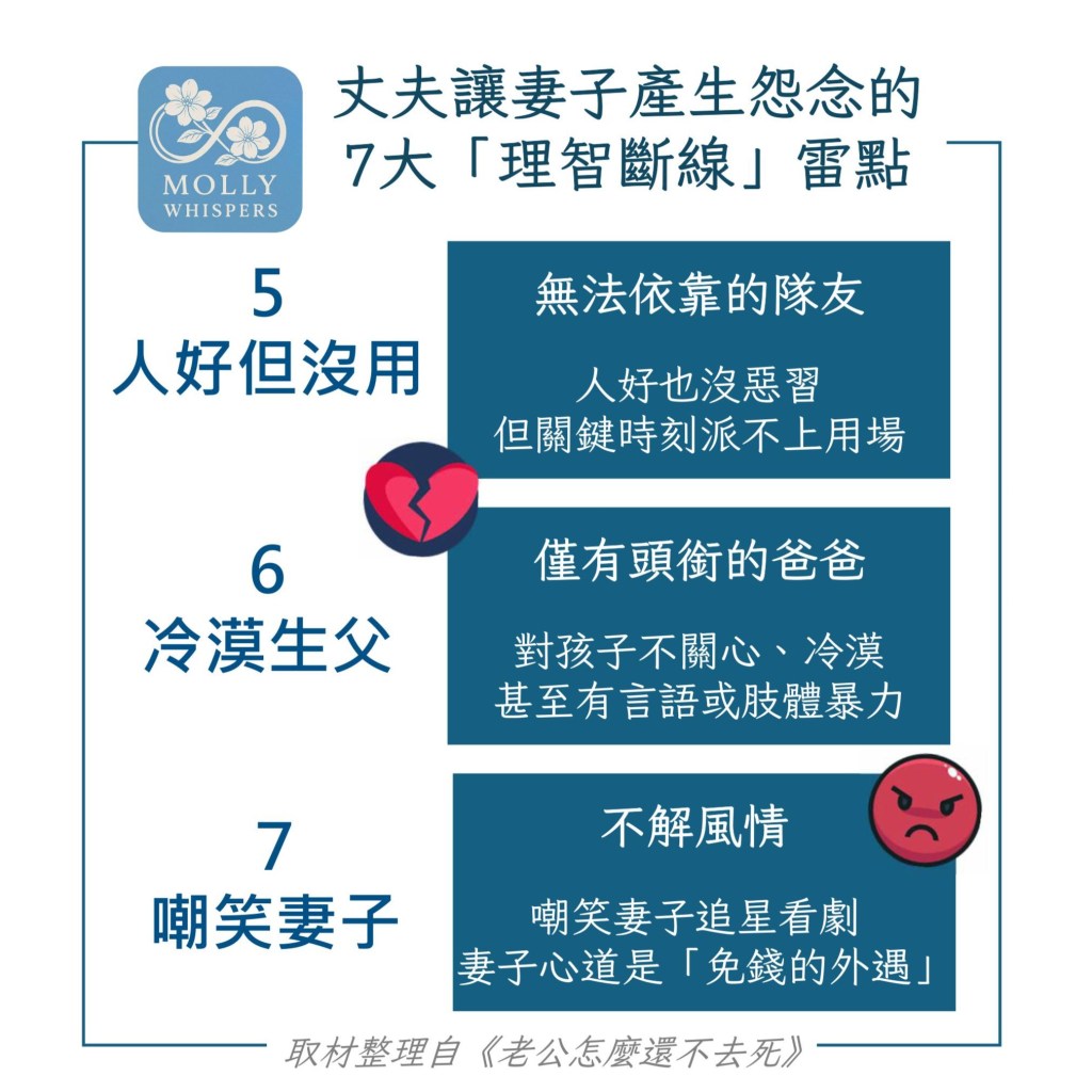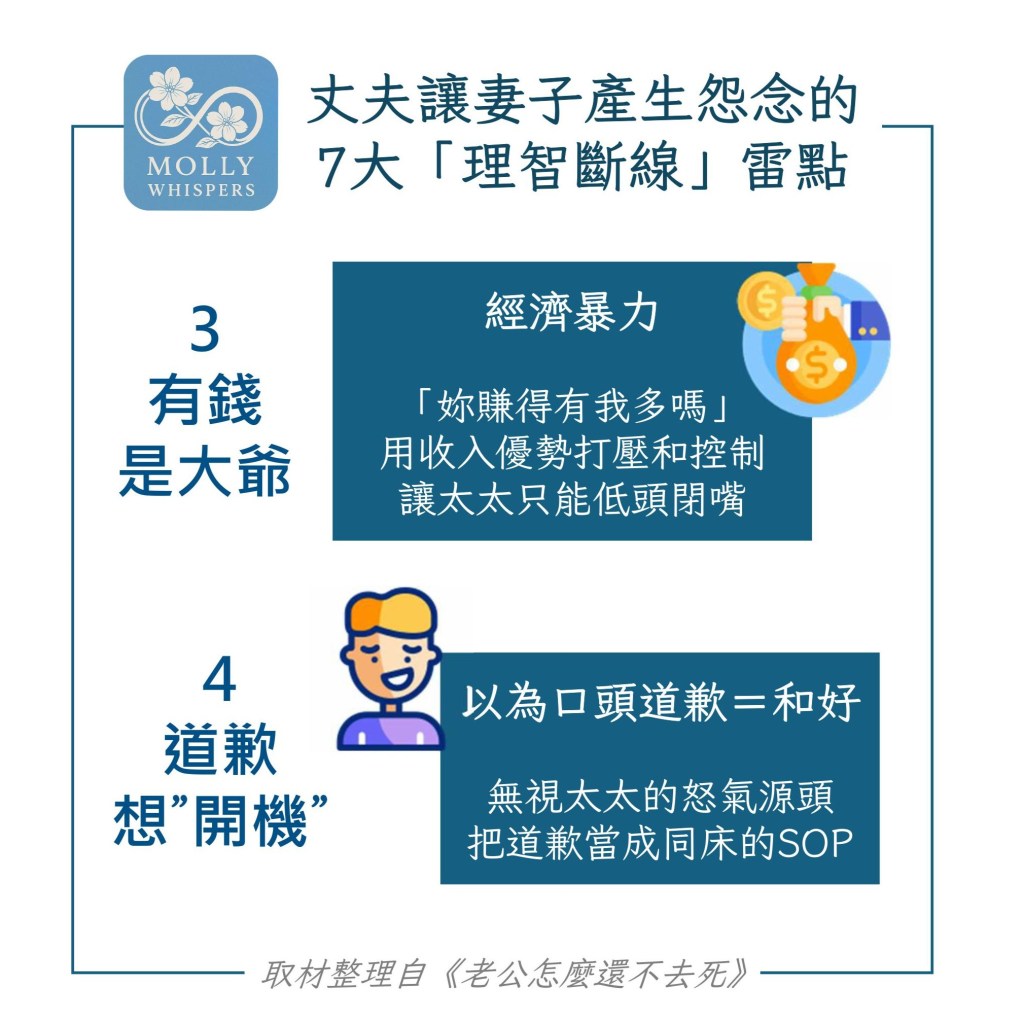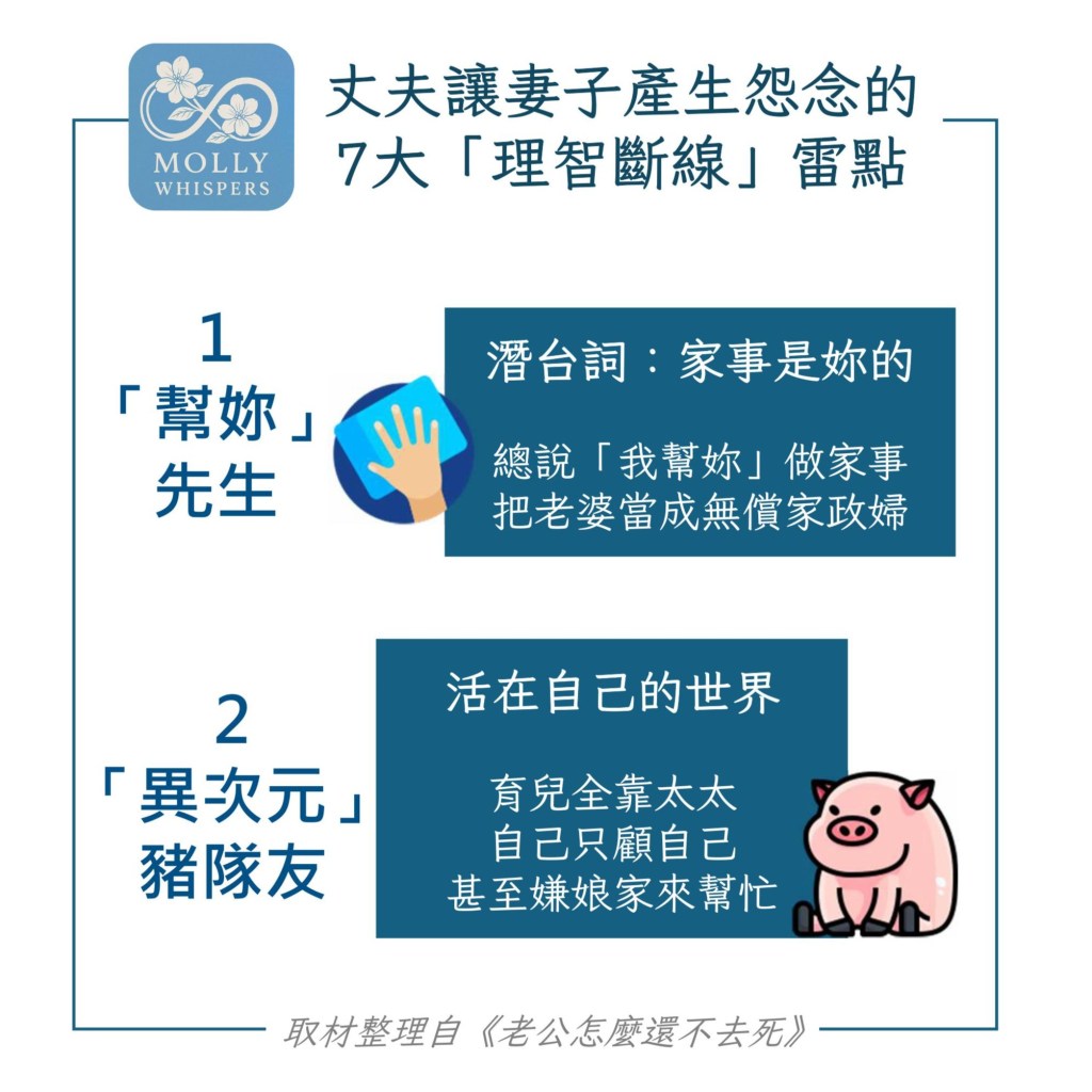 - 全職主婦也沒比較好過,老公把所有家務和教養責任都丟過來,還時不時補刀「妳又沒賺錢」;若又與公婆同住,壓力更是加倍