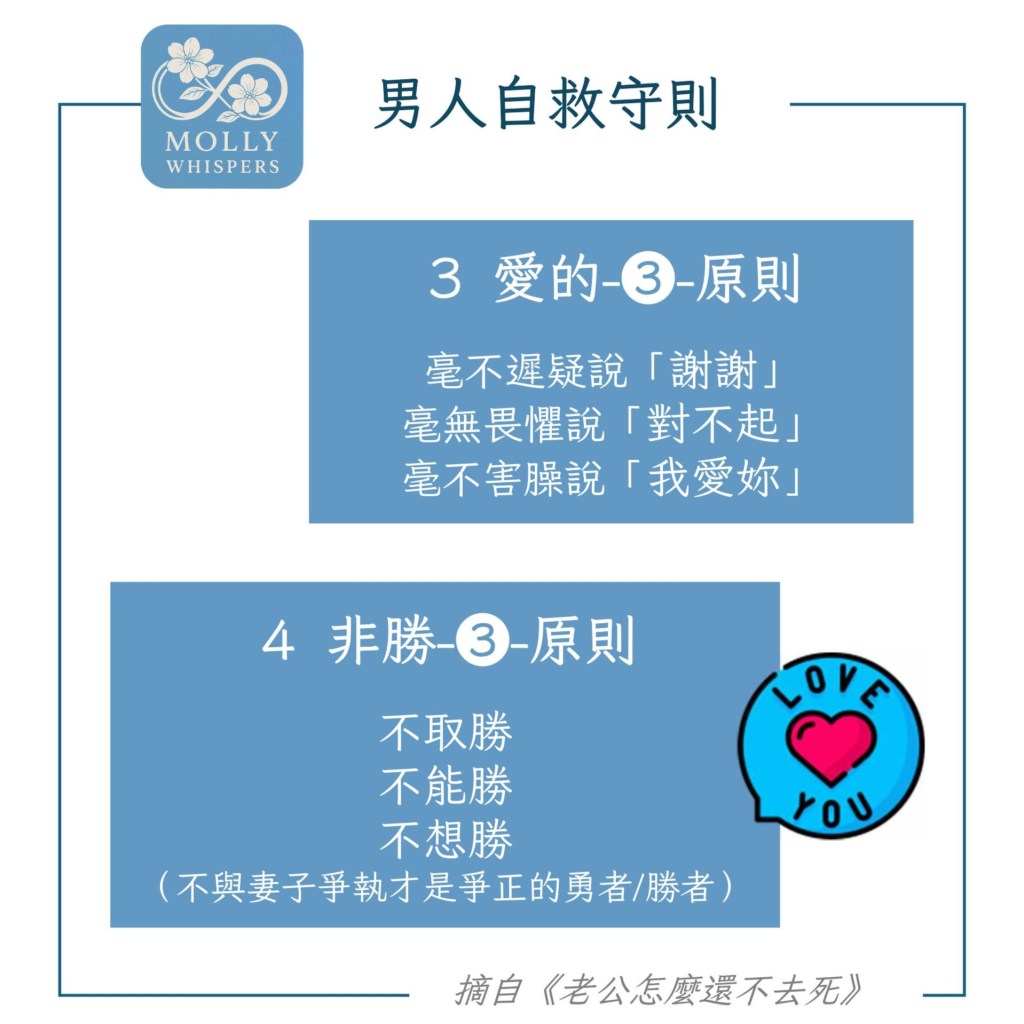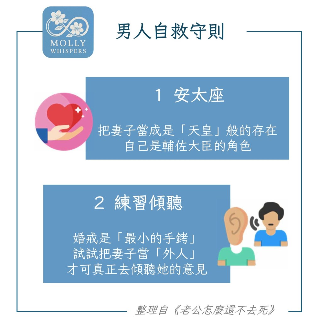 本書內容以女性角度為出發,寫到男性的篇幅只佔一丁點。茉莉請男生讀者先別生氣或急著反駁,建議把它當成一本「婚姻求生指南」,壓力會小一點。