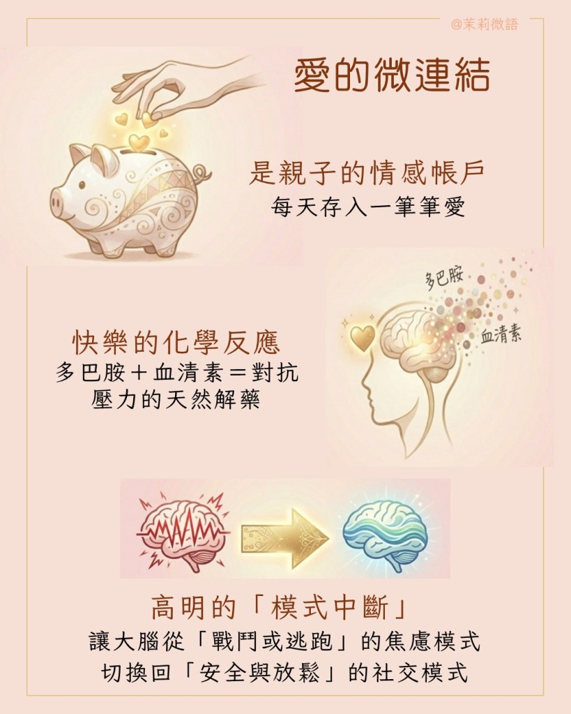 這些情感連結,也是一種高明的「模式中斷」,我們讓孩子的大腦從「戰鬥或逃跑」的焦慮模式,切換回「安全與放鬆」的社交模式,讓他們在充滿挑戰的世界裡,隨時能感受到家人無條件的愛。