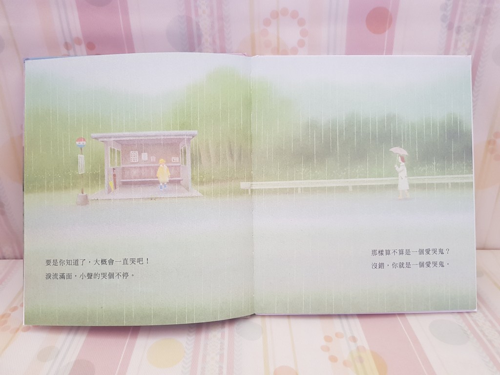 書中的畫面下著雨,作者用自然的雨滴象徵著人類真情流露的哭泣。但隨即,爺爺非常貼心的說: